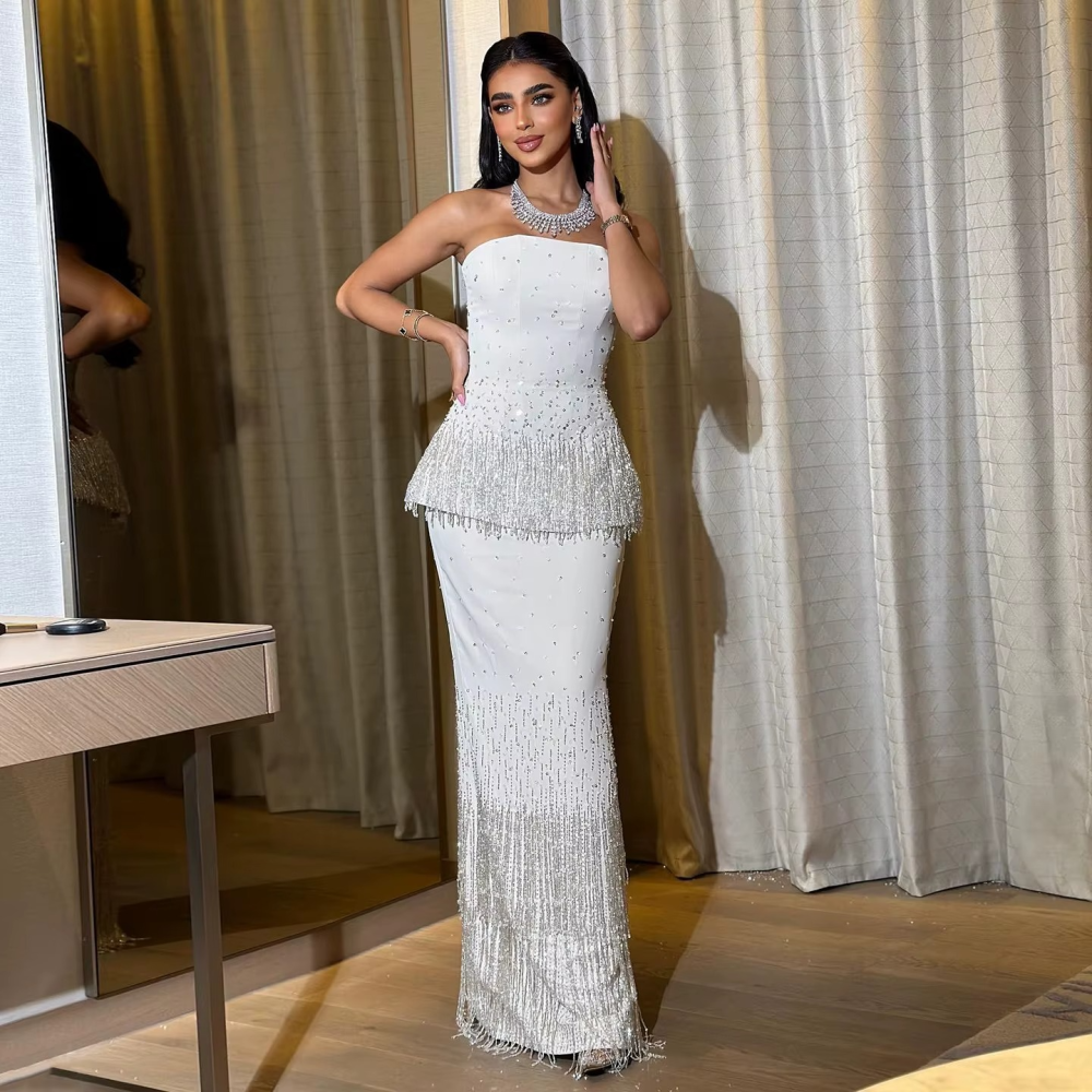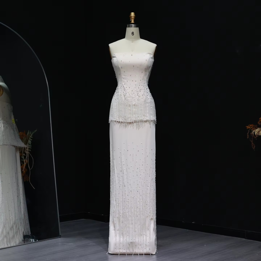 فستان سهرة فاخر ناعم من قطعتين كورسيه وتنورة مطرز مع هدب