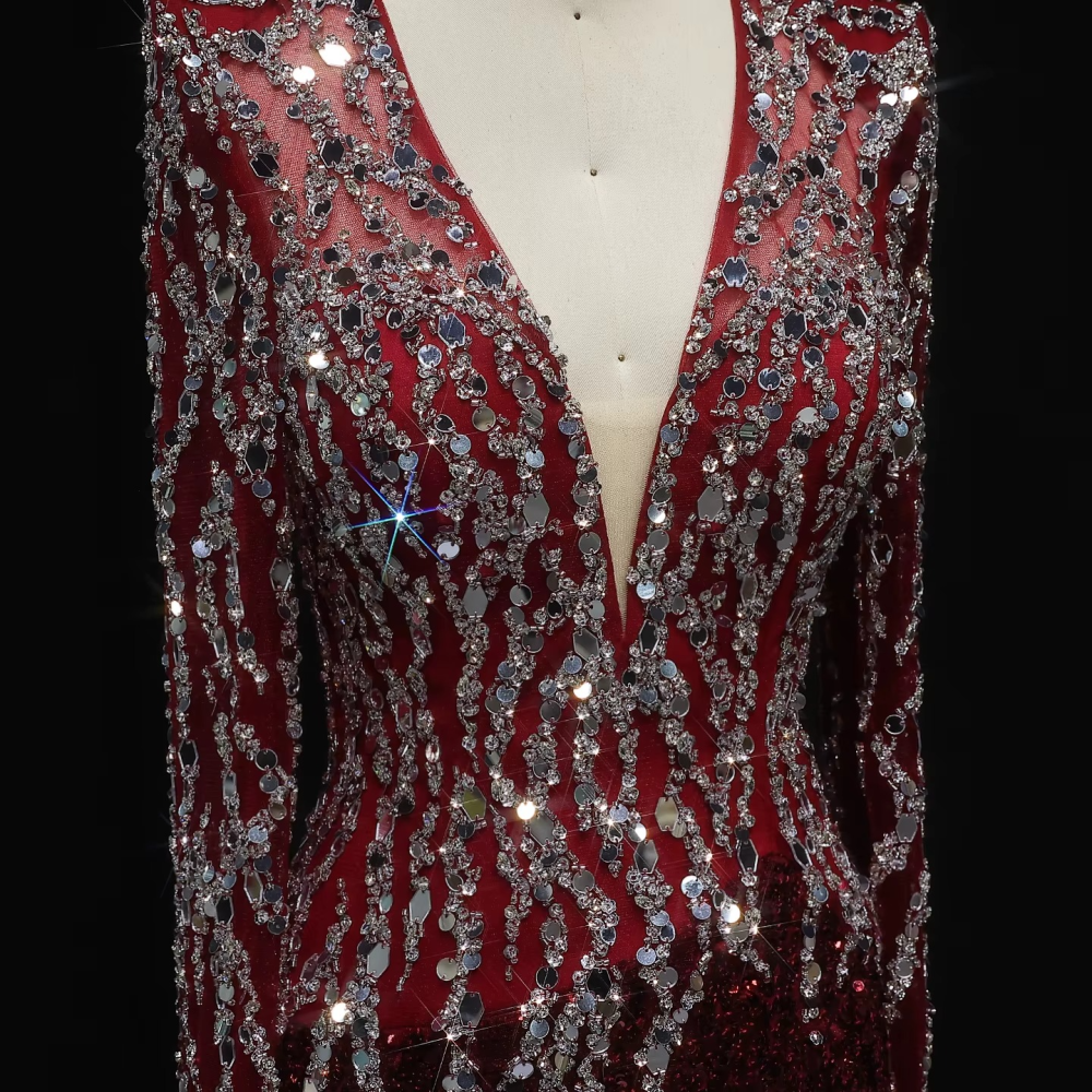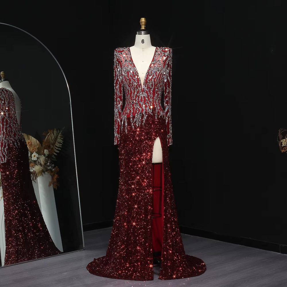 فستان سهرة مثير بقصة V بأكمام وفتحة الظهر و الساق