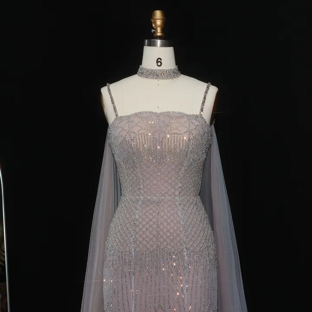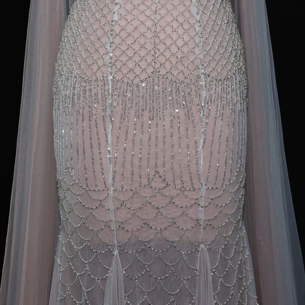 فساتين مناسبات مطرز بتفاصيل أنيقة مع كيب شفاف ينسدل بانسيابية، تصميم مثالي لإطلالة راقية تبرز أنوثتك بجاذبية ملفتة في المناسبات والسهرات الراقية.