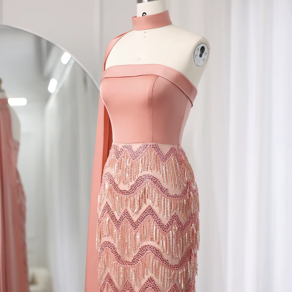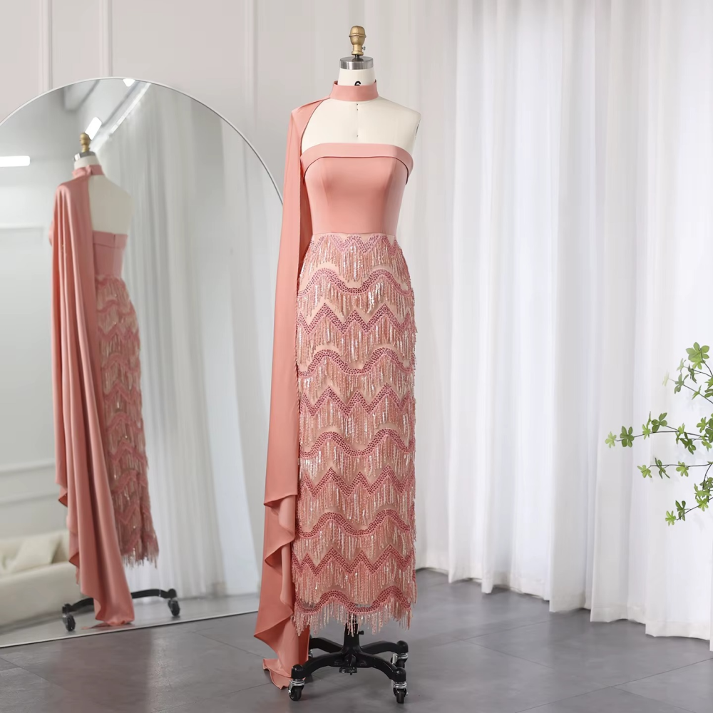 فستان سهرة فاخر مع تطريز هدب و وشاح كيب
