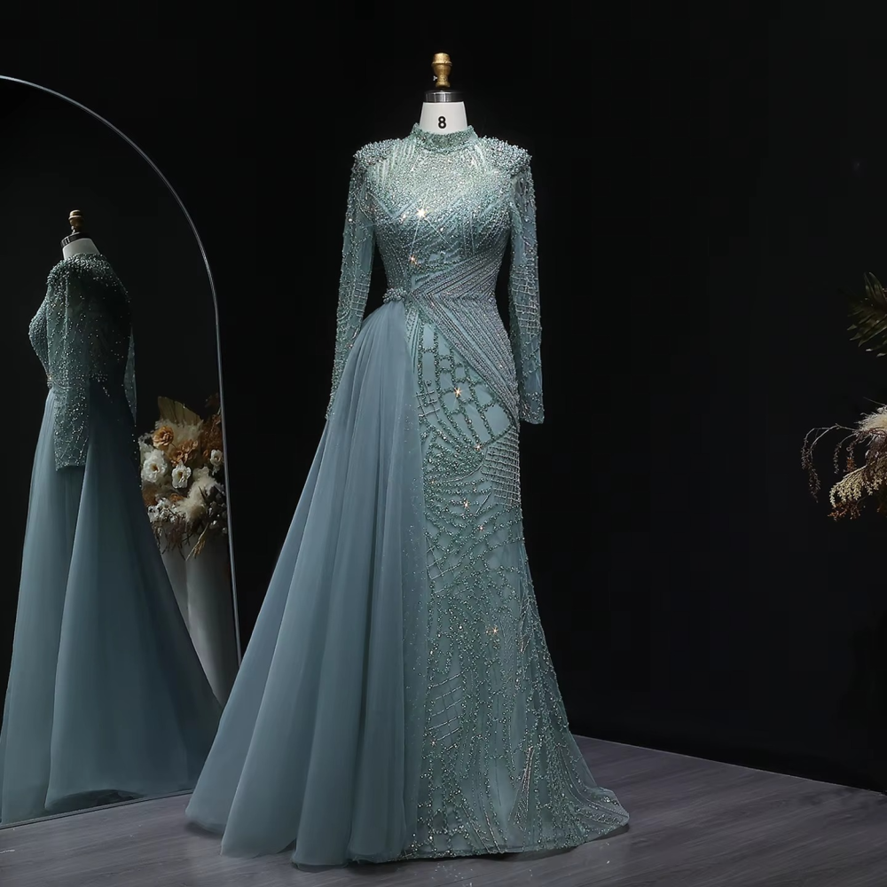 - اسم المنتج: فستان سهرة فاخر بأكمام طويلة وتنورة جانبية