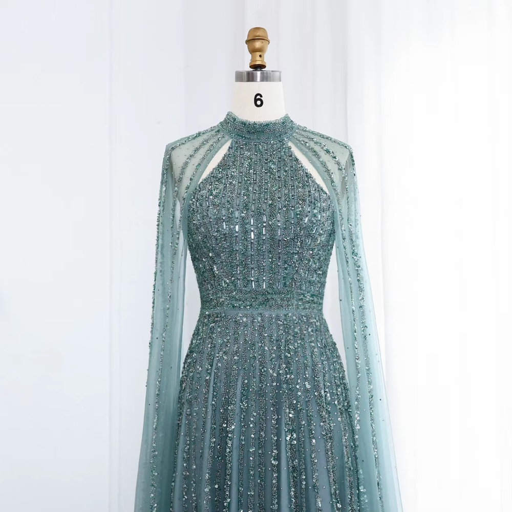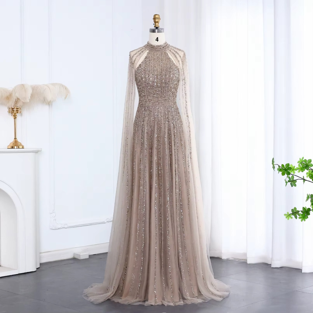 فستان سهرة فاخر بأكمام كيب عالي الرقبة