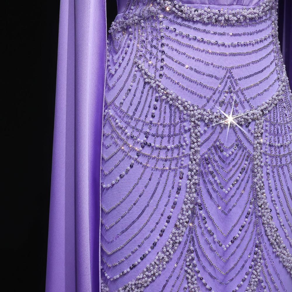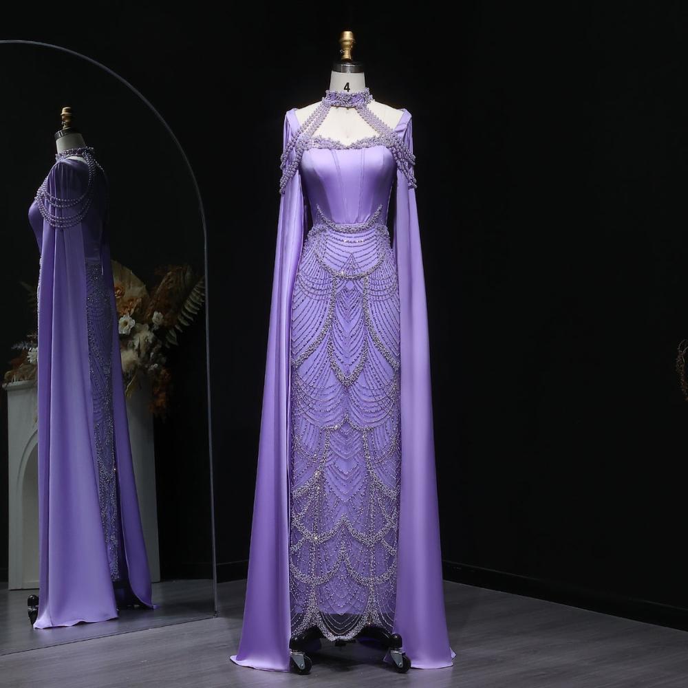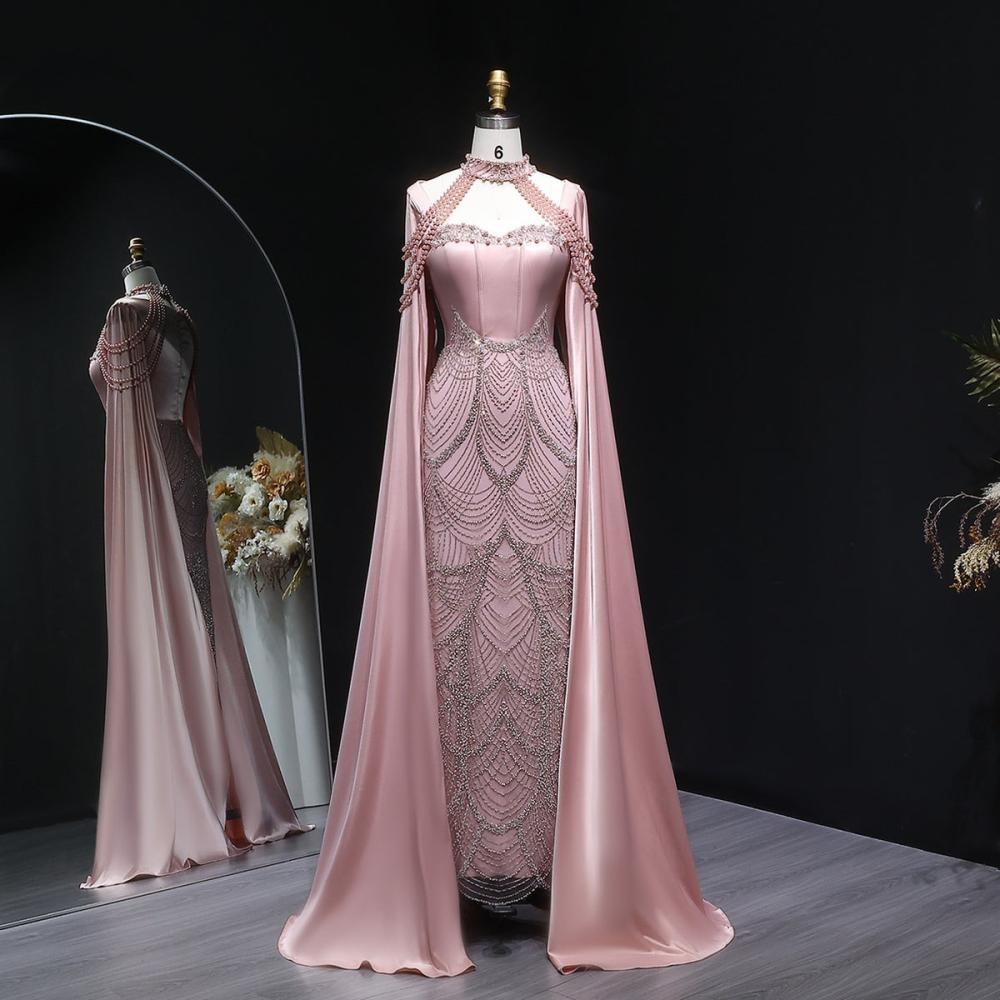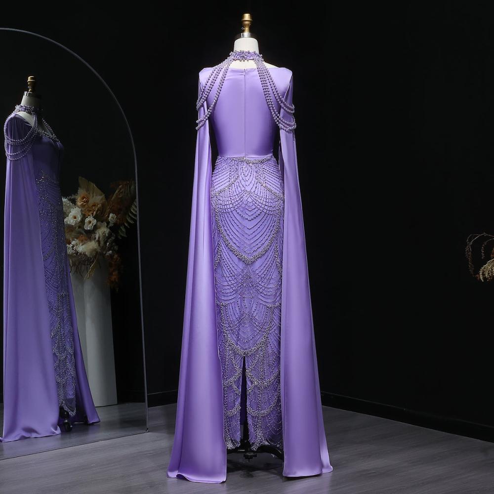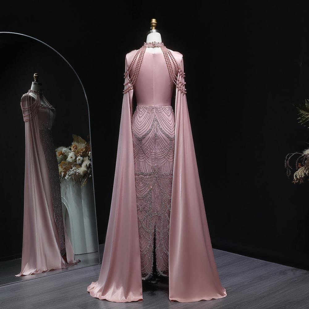 فستان سهرة فاخر مطرز كرستال مع كيب مزين باللؤلؤ