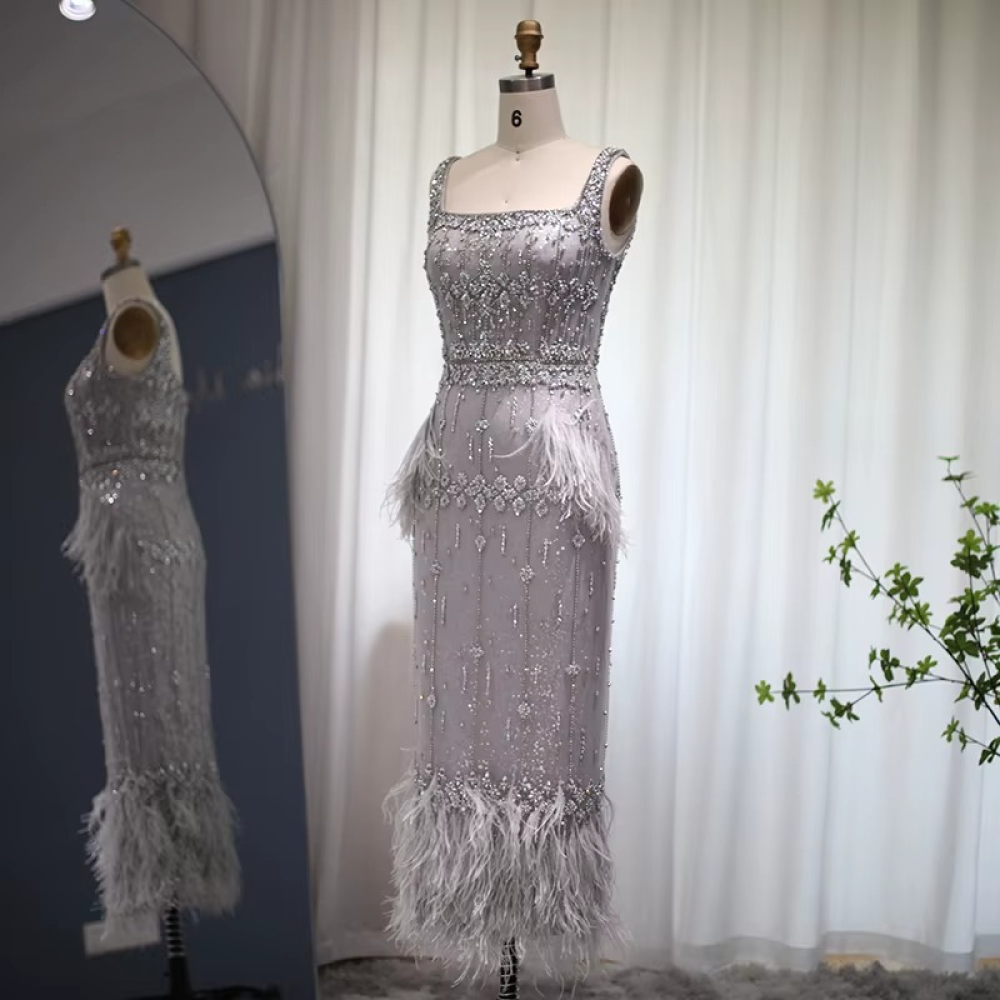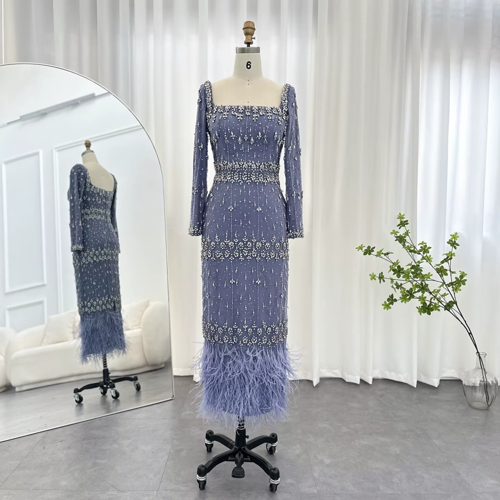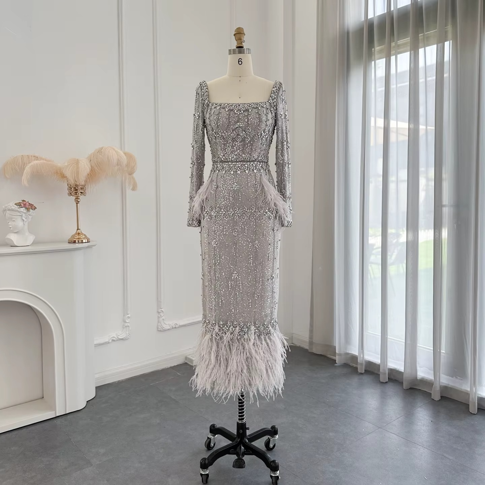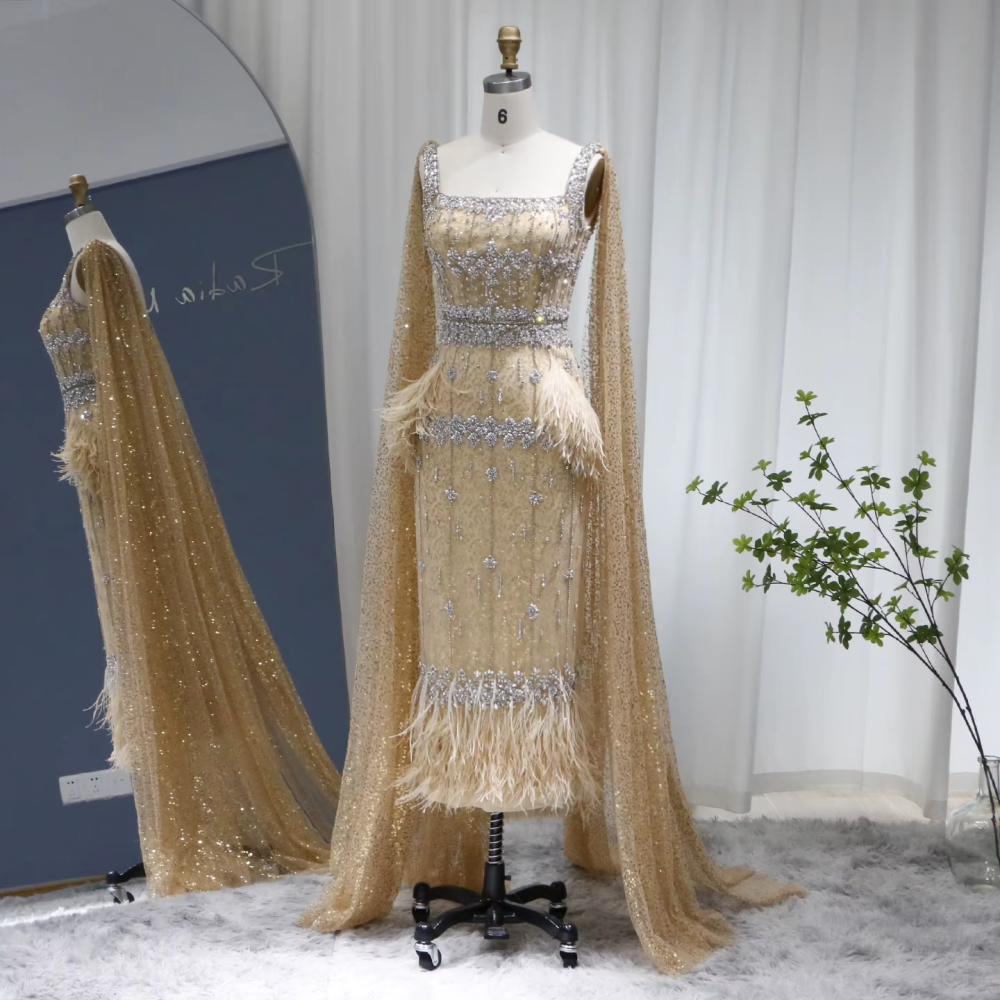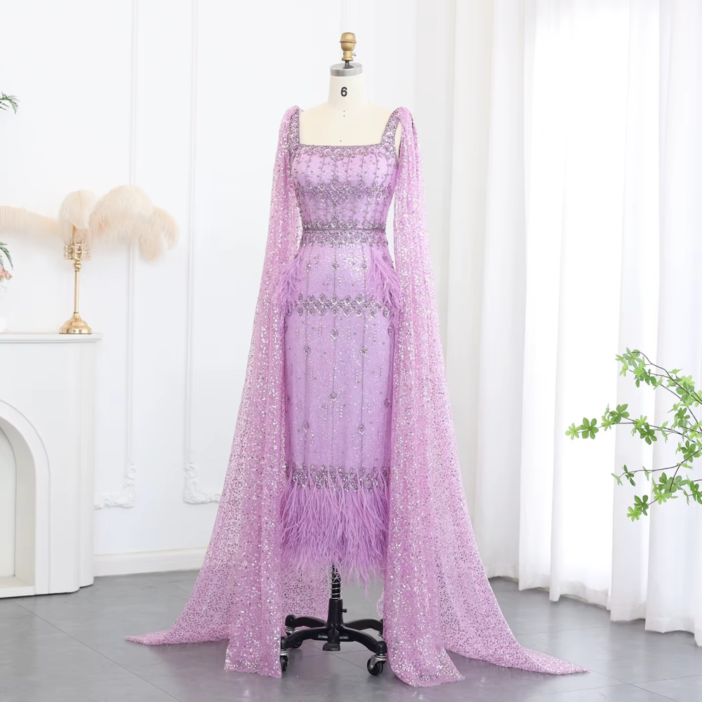 فستان سهرة فاخر مطرز مع كيب و ريش