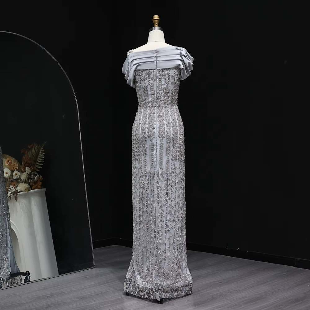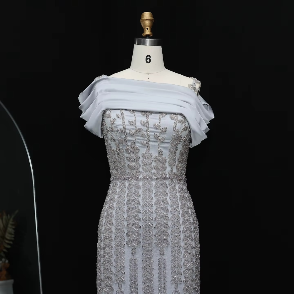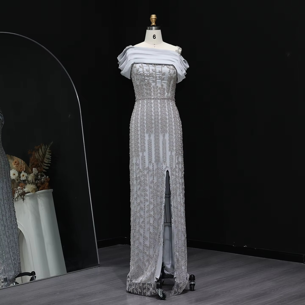 - اسم المنتج: فستان سهرة بدون أكتاف مطرز باللؤلؤ