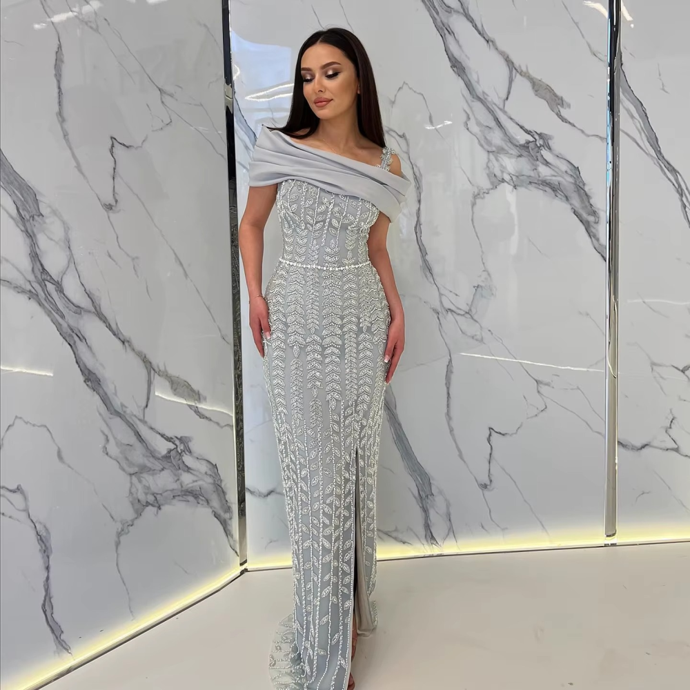 فستان سهرة ناعم بدون أكتاف بتطريز فاخر من اللؤلؤ، يبرز أنوثتك بجاذبية راقية وتصميم ملكي يجعل إطلالتك متألقة في كل مناسبة خاصة.