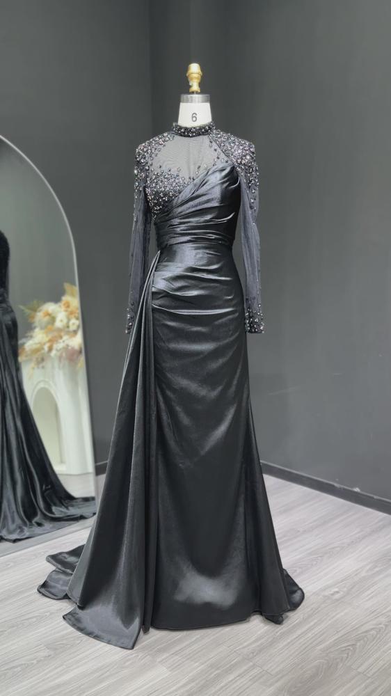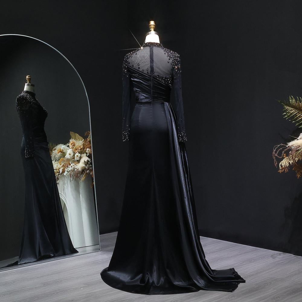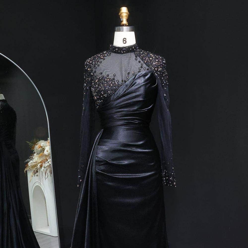 - اسم المنتج: فستان سهرة فاخر أسود بأكمام وذيل