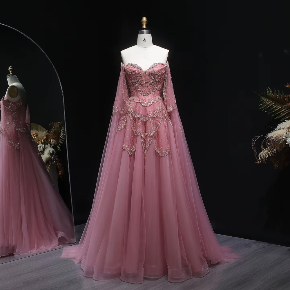 - التصميم: بدون أكتاف، قصة صدر قلب، أكمام كيب