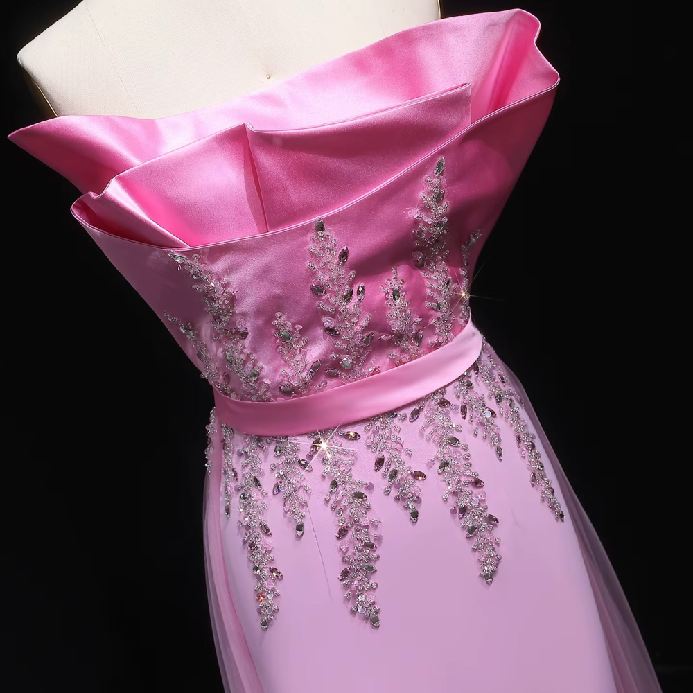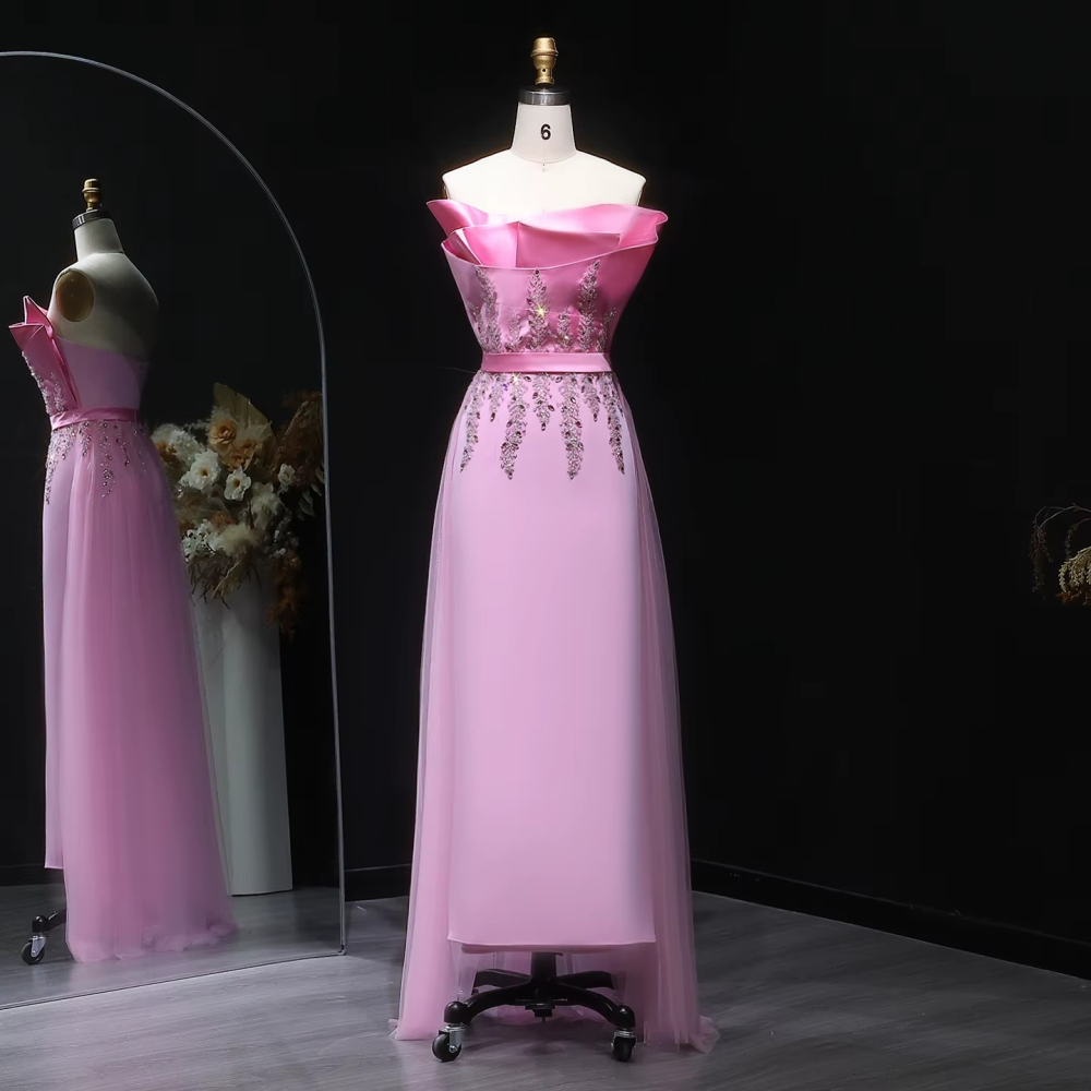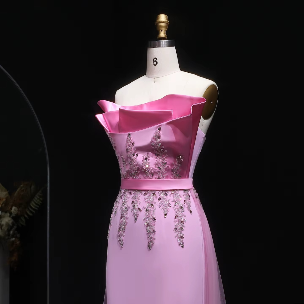 فستان لون بينك فاخر بذيل تل كشكشة يمنحك إطلالة حالمة وأنثوية في المناسبات الراقية، بتفاصيل راقية وتصميم أنيق يبرز جمالك الطبيعي.